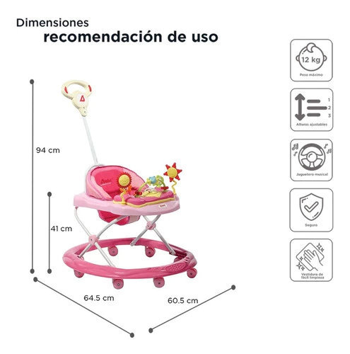 Esta andadera musical, cuenta con juguetero electrónico con sonidos que favorece el desarrollo de las capacidades visuales, auditivas y de la coordinación motora de tu bebé.