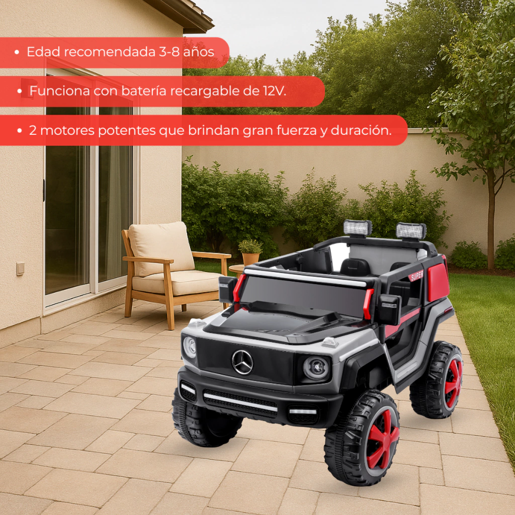 Este modelo de carro eléctrico funciona con una batería recargable de 12V y está equipado con dos motores, ofreciendo potencia y estabilidad. Si buscas un carro montable eléctrico control de gran calidad y con excelentes acabados, esta es la opción perfecta para acompañar la diversión de tus hijos.