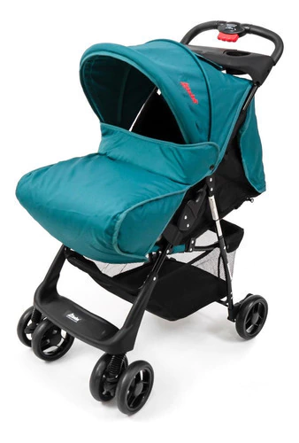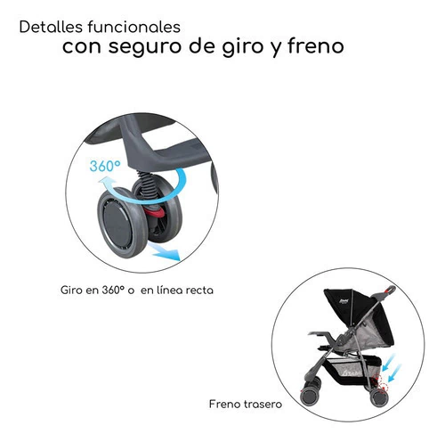 La carriola cuenta con elementos de seguridad para el bebé, recomendados por normas internacionales, como el cinturón de seguridad con 3 puntos de fijación, freno trasero y seguro de giro en las llantas delanteras. Además tiene una bolsa cubre-pies desmontable que evita que el bebé se deslice fuera de la carriola.