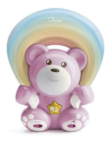 El Chicco proyector Musical Rainbow Bear cuenta con dos modos de entretenimiento, el primero es un arco iris estático y melodías clásicas, mientras que el segundo el arcoíris aparece color tras color, junto con la música New Age. Además, Viene con un selector de volumen para controlar el sonido y 15 - 30 minutos de ciclo de melodías clásicas. Así como, una solapa trasera con espejo curvo para personalizar el ancho y la dirección de la proyección en función de la habitación y la ubicación del objeto.