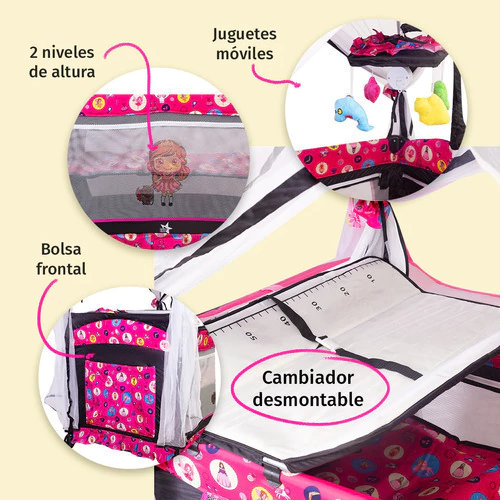 Este corral cuna está equipado con un cambiador con diseño en forma de “u” para una mayor seguridad a la hora de cambiar al bebé. Viene también con una innovadora regla con la que podrás medir el crecimiento de tu pequeño. Además cuenta con ruedas con las que podrá moverlo a donde quiera y estas mismas tienen freno para poder inmovilizarlo.