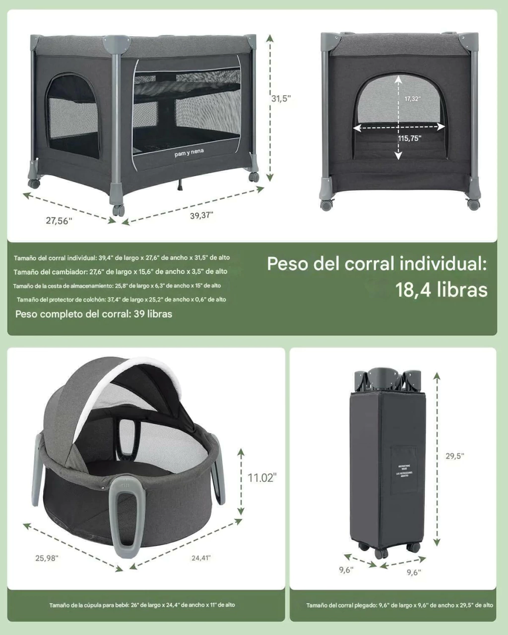 Su diseño multifuncional y compacto lo convierte en la mejor opción para casa o viajes. El corralito mide 39.4" de largo x 27.6" de ancho x 31.5" de alto, mientras que el colchón tiene 37.4" x 25.2" x 0.6" y el domo 26" x 24.4" x 11".