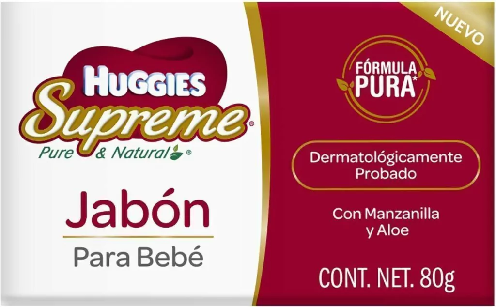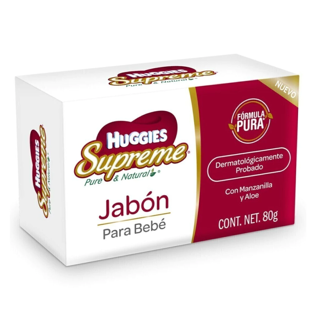 El jabón para bebé de Huggies Supreme con manzanilla y aloe vera cuida, limpia y humecta la piel de tu bebé de manera natural con un delicioso aroma. Dermatológicamente comprobado.