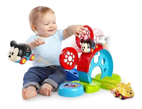 Prepárate para competir, rebotar y voltear los autos Go Grippers favoritos de tu bebé. Con una escoba y un zoom, los autos correrán por la rampa de velocidad a través de la cúpula de Mickey.