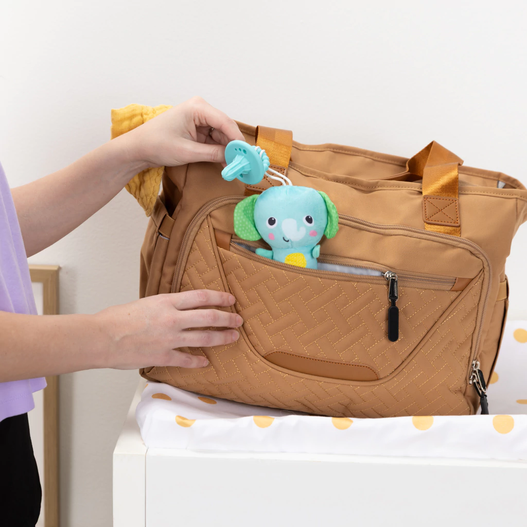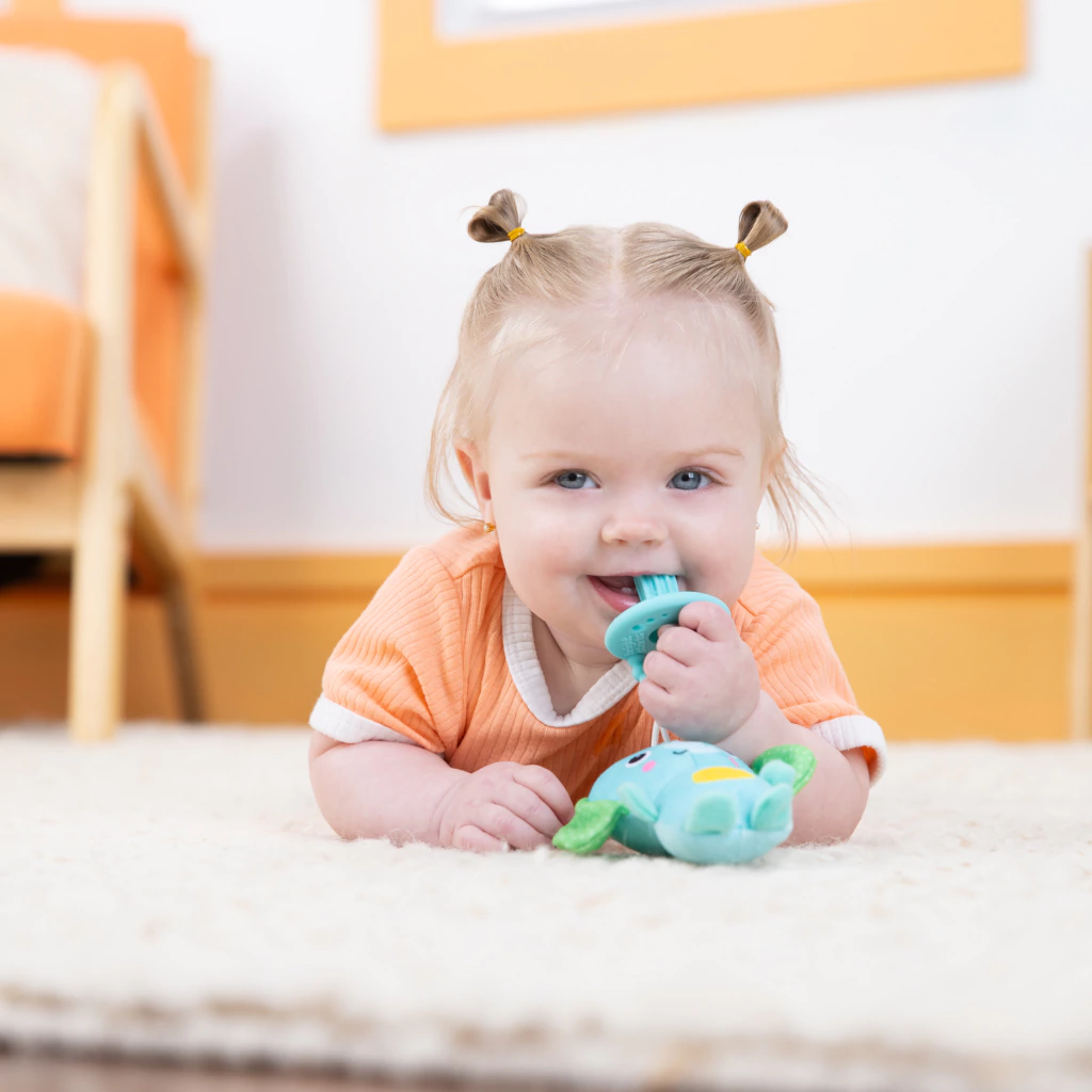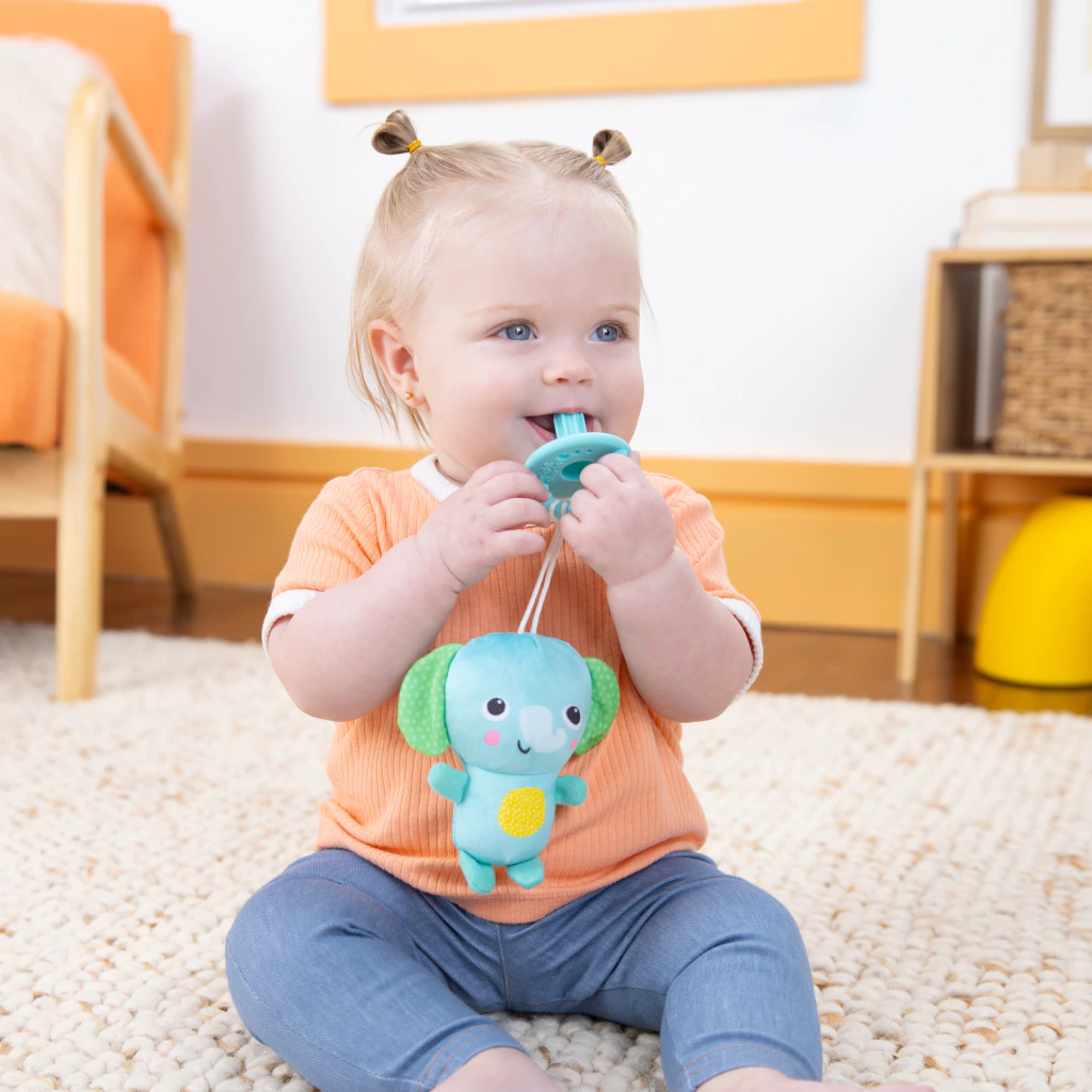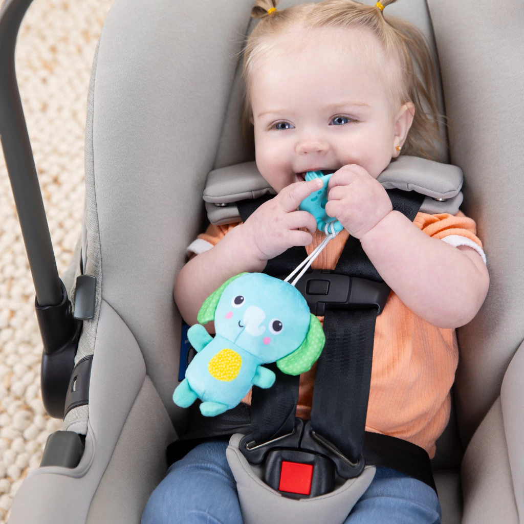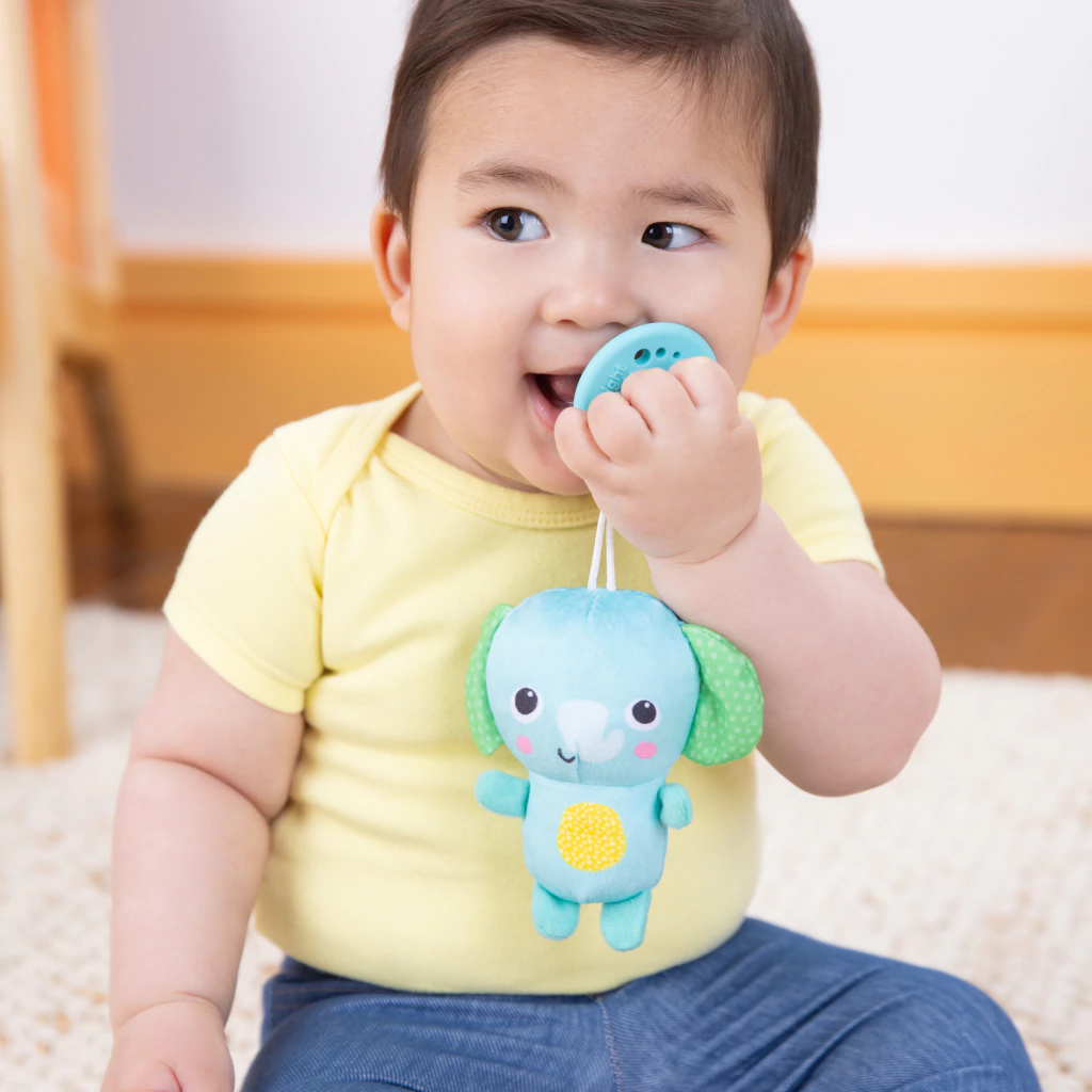 Dale a tu bebé comodidad y diversión durante la dentición con la mordedera con peluche SootheMate de Bright Starts. Este adorable elefante de peluche incluye un mordedor para bebé de silicona desmontable que ayuda a aliviar el dolor de encías mientras reconforta al pequeño. Diseñado especialmente para sus manitas, el bebé puede agarrar fácilmente a su nuevo amigo y aprender a aliviarse por sí mismo durante la dentición. El mordedor extraíble permite a los padres separarlo del peluche para limpiarlo y desinfectarlo con facilidad, manteniendo la higiene del juguete. Su tamaño portátil hace que esta mordedera para bebé sea ideal para llevar a cualquier lugar, ya sea al parque, de paseo o de visita a la familia, y cabe prácticamente en cualquier bolsa de pañales. La limpieza es sencilla: solo separa el peluche y lava el mordedor con un paño húmedo y jabón neutro. Estas mordederas bebé son un regalo perfecto para baby showers, Navidad y muchas ocasiones especiales, pensado para bebés desde recién nacidos. Con la mordedera con peluche SootheMate, aliviar la dentición nunca fue tan fácil y tierno.