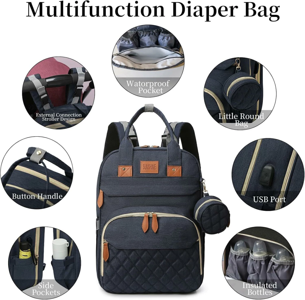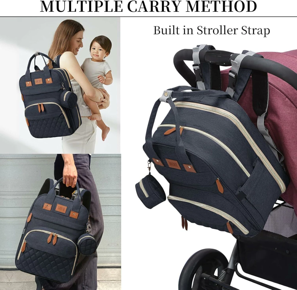 Esta bolsa para pañales de bebé incluye 1 bolsillo grande, 1 bolsillo con función de cuna y cambiador, 3 bolsillos aislantes + 2 bolsillos exteriores para biberones (aptos para todos los biberones principales), un bolsillo para toallitas y un llavero. Se adapta a tabletas y computadoras portátiles. Las cremalleras de fácil deslizamiento hacen que esta mochila para cambiar pañales sea fácilmente accesible con una mano.