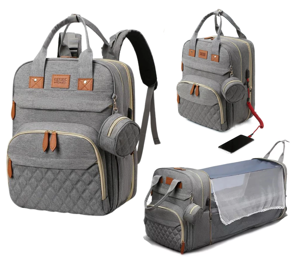 - Compartimentos: 1 bolsillo grande, 1 bolsillo con función de cuna y cambiador, 3 bolsillos aislantes + 2 bolsillos exteriores para biberones (aptos para todos los biberones principales), un bolsillo para toallitas y un llavero