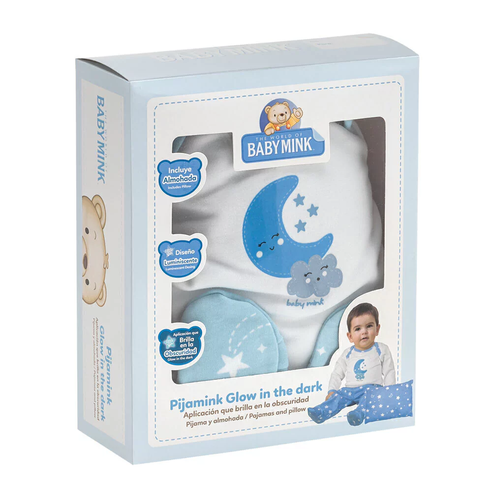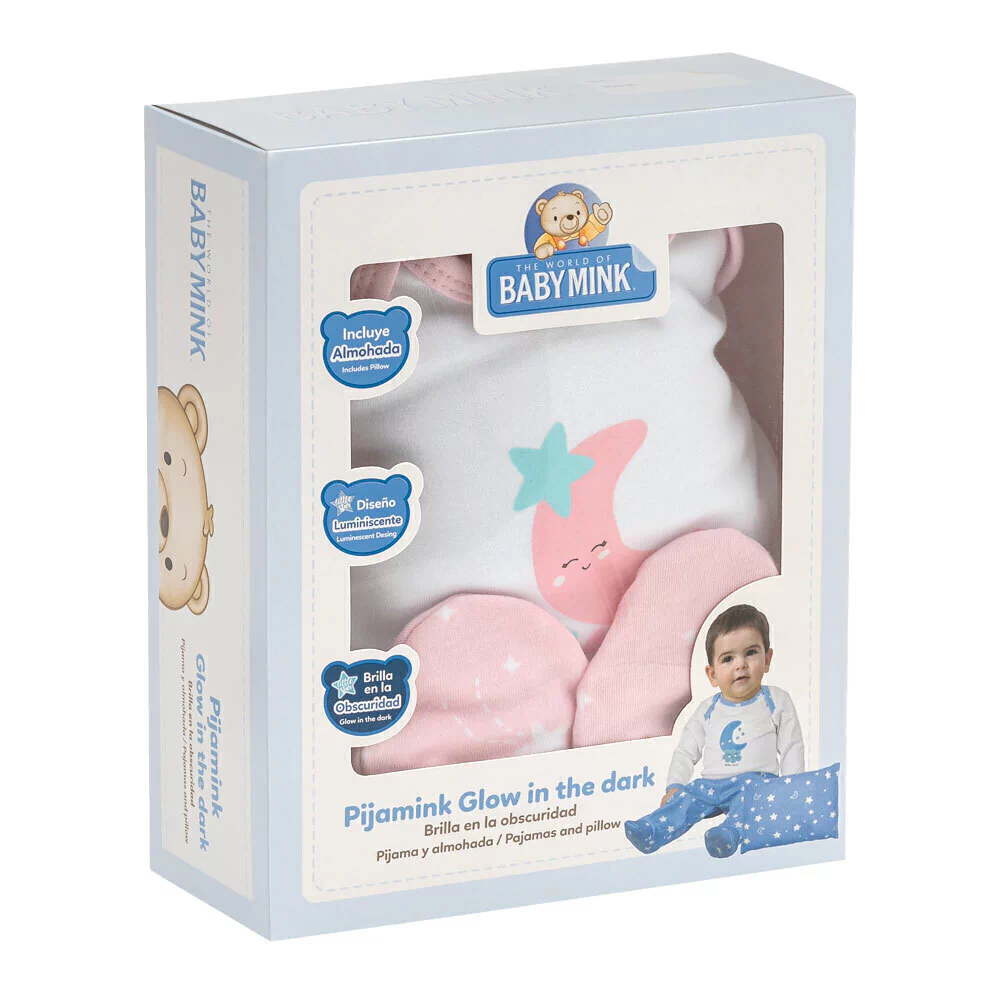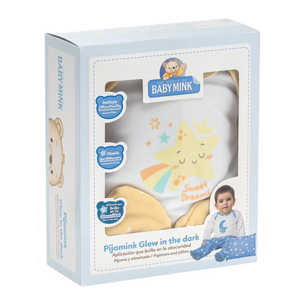Este adorable set de descanso para bebé incluye una pijama calientita y una suave almohada, diseñadas para brindar comodidad, relajación y calidez en cada siesta. La pijama, compuesta por una camiseta de manga larga y un pantalón con pies, cuenta con un increíble efecto que brilla en la oscuridad, haciendo que la hora de dormir sea aún más especial. Fabricado con tela Interlock de alta calidad en una mezcla de 50% algodón y 50% poliéster, es ideal para bebés de 3 a 6 meses. ¡Dale a tu pequeño el descanso que merece con este encantador set!