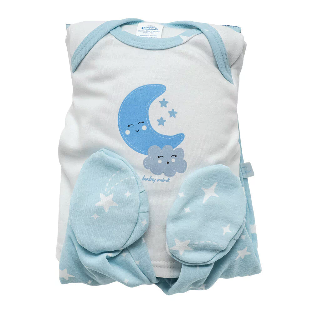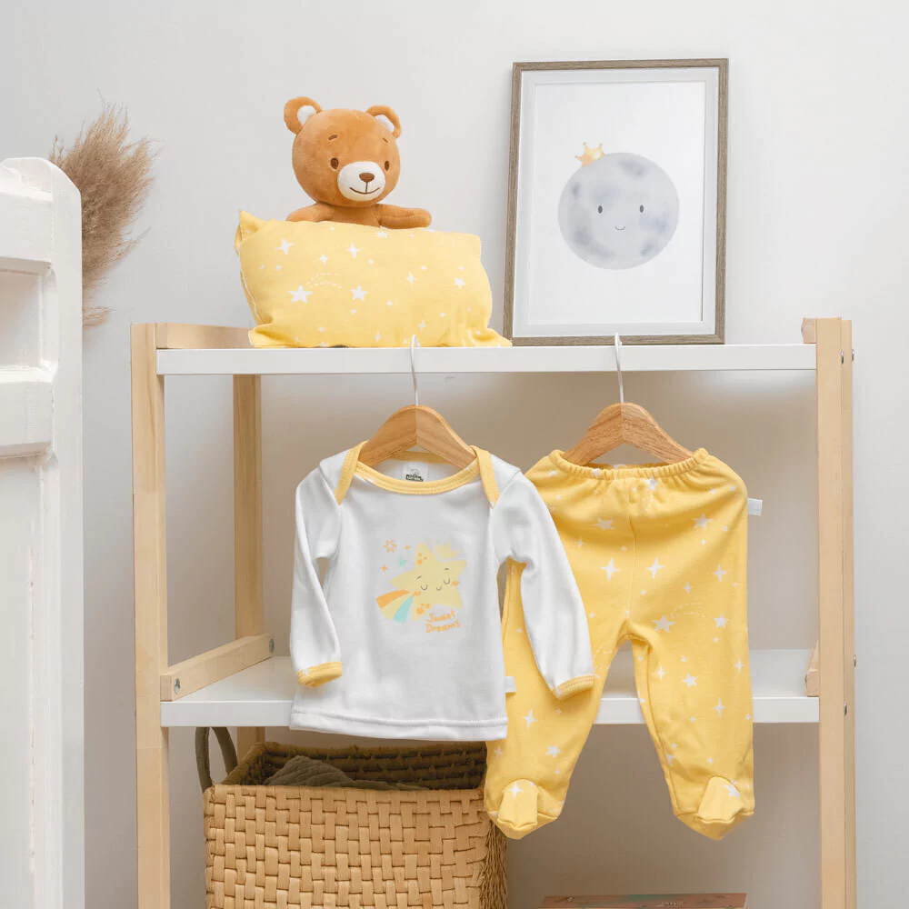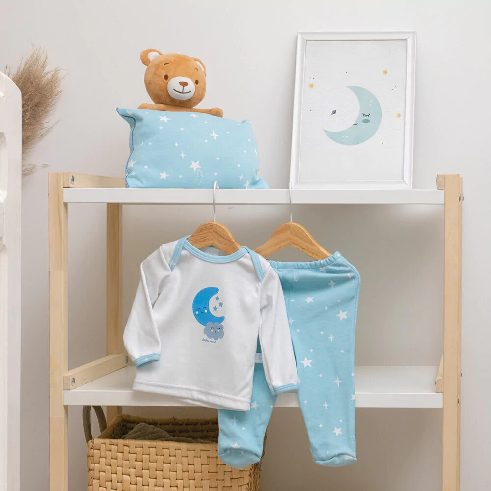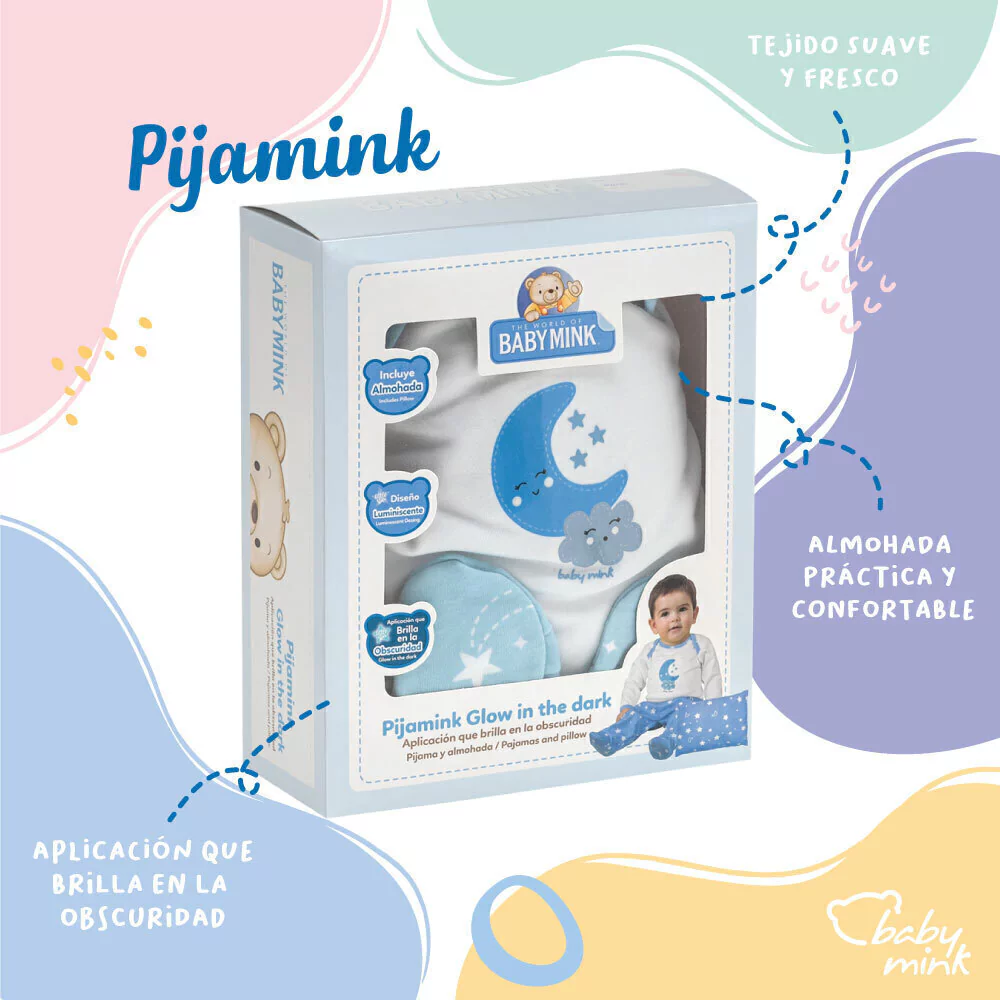 Este adorable set de descanso para bebé incluye una pijama calientita y una suave almohada, diseñadas para brindar comodidad, relajación y calidez en cada siesta. La pijama, compuesta por una camiseta de manga larga y un pantalón con pies, cuenta con un increíble efecto que brilla en la oscuridad, haciendo que la hora de dormir sea aún más especial. Fabricado con tela Interlock de alta calidad en una mezcla de 50% algodón y 50% poliéster, es ideal para bebés de 3 a 6 meses. ¡Dale a tu pequeño el descanso que merece con este encantador set!