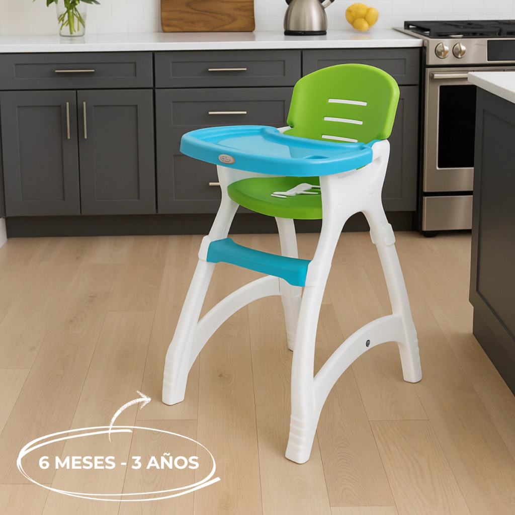 La Silla Para Comer Dinner cuenta con un asiento cómodo con respaldo reforzado y charola ajustable a 3 posiciones con portavasos, incluye descansa pies, y posee un cinturón de seguridad de 3 puntos.